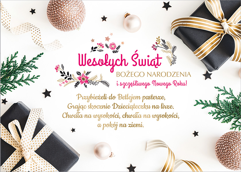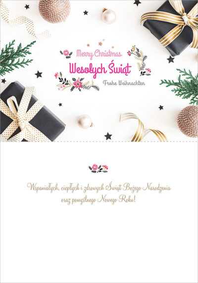 uszlachetnienie: brokat, kolorowy zadruk środka, koperta w komplecie, dostępny w wersji z gotowym, nadrukowanym już wewnątrz tekstem życzeń
