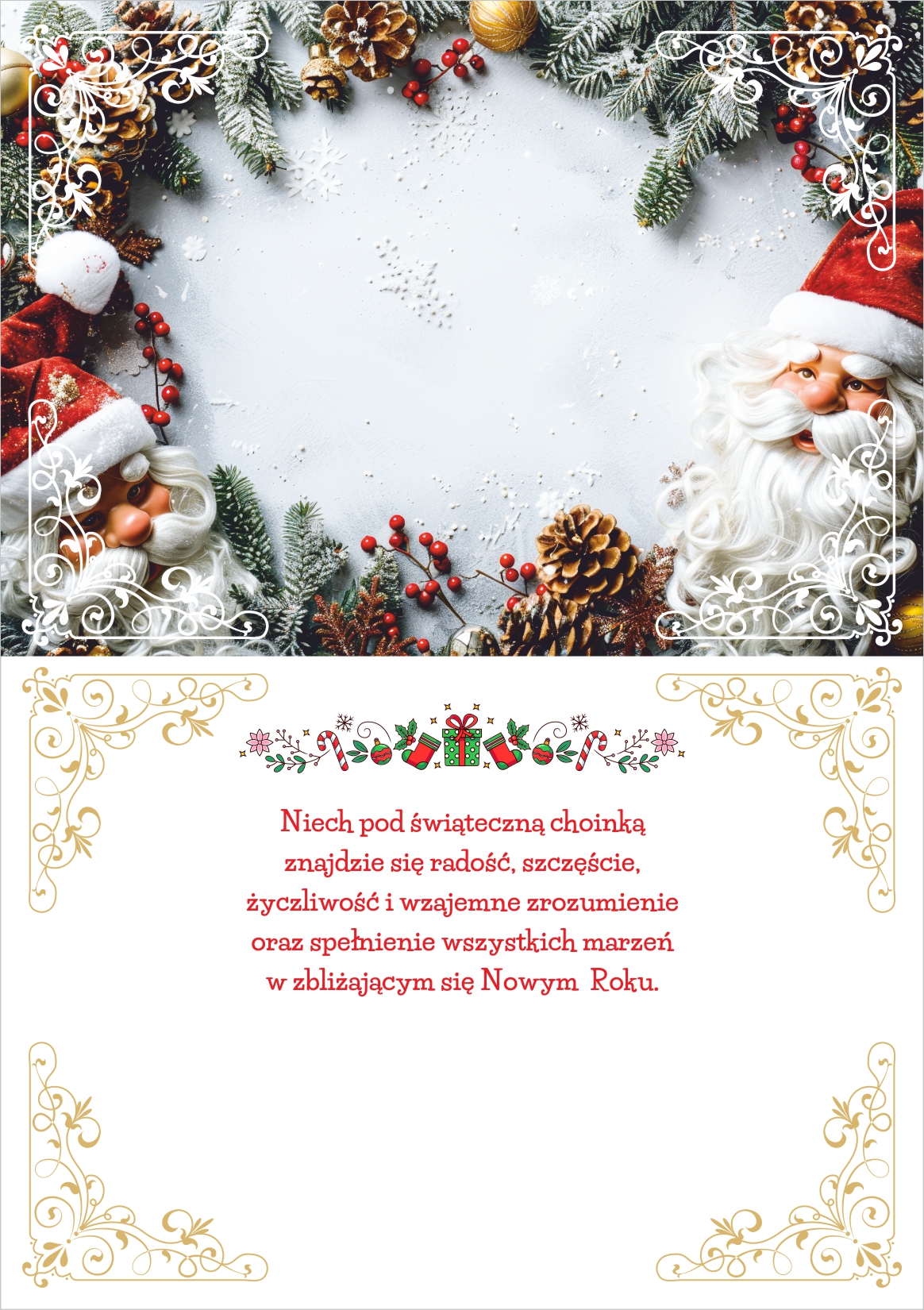 uszlachetniony brokatem, kolorowy zadruk środka, koperta w komplecie, dostępny w wersji z gotowym, nadrukowanym już wewnątrz tekstem życzeń