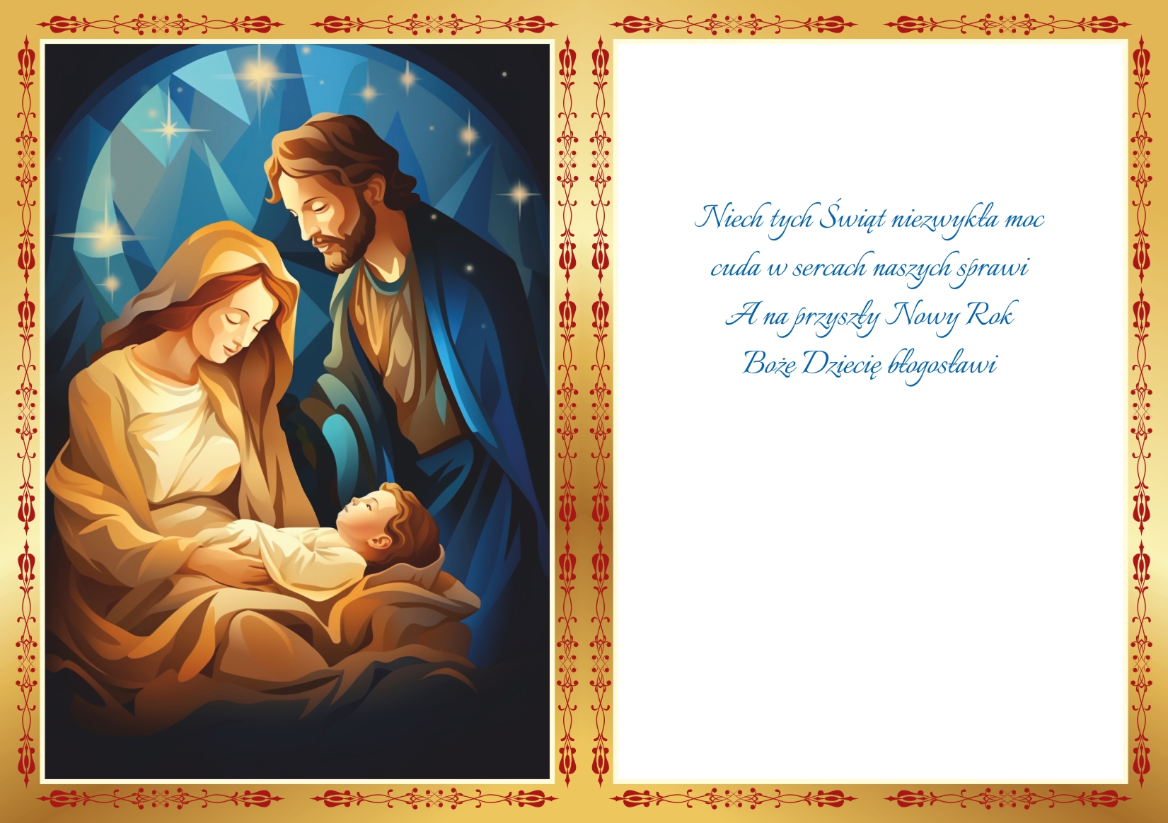 uszlachetniony brokatem, kolorowy zadruk środka, koperta w komplecie, dostępny w wersji z gotowym, nadrukowanym już wewnątrz tekstem życzeń